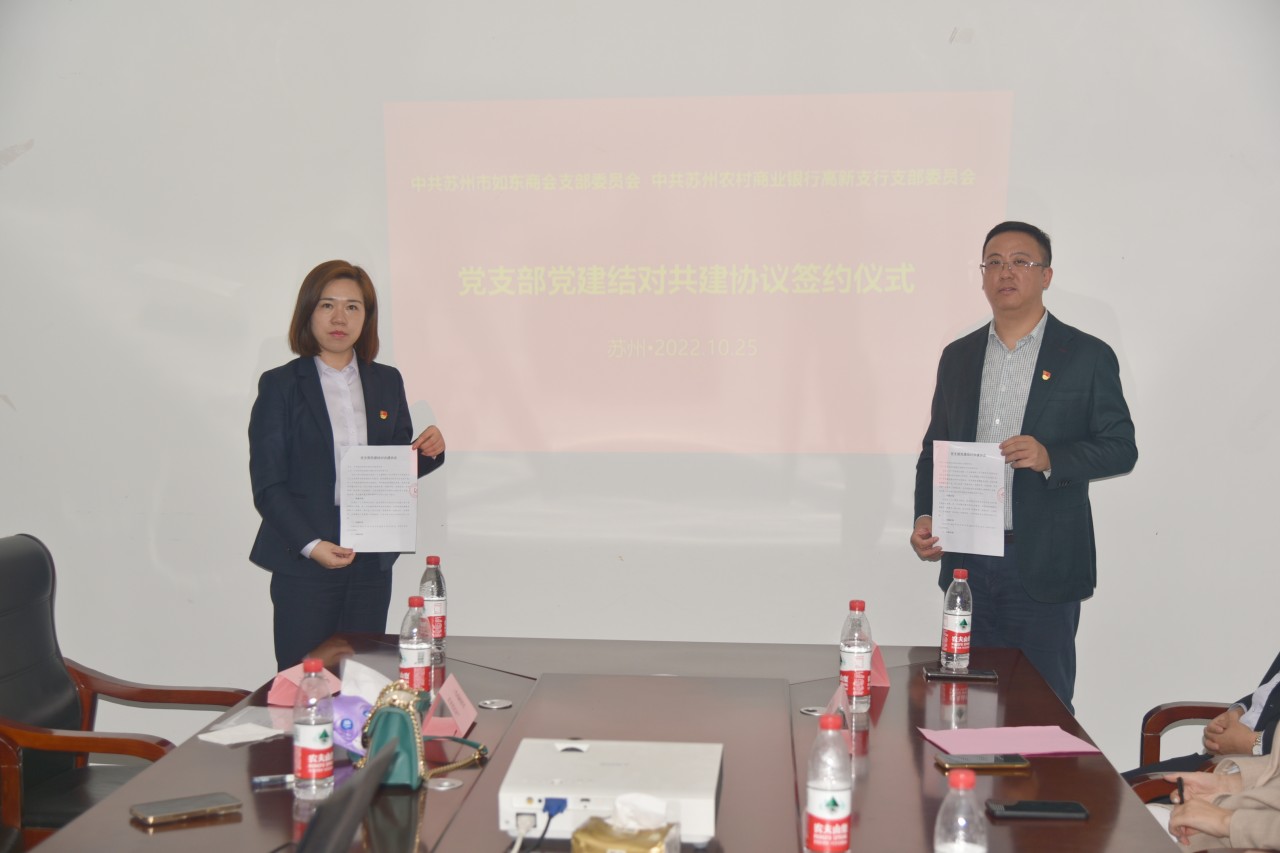 主题党日活动结束后,苏州市如东商会党支部和苏州农商银行高新支行党支部举行了党建结对共建仪式。周鹏飞、马海燕分别代表苏州市如东商会党支部和苏州农商银行高新支行党支部在党建结对共建协议书上签了字。