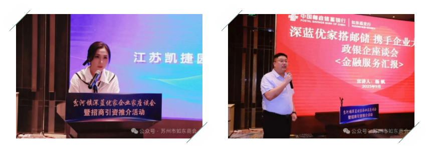 深蓝优家商务经理张莹详细介绍园区基本情况、运营模式与发展规划。中国邮政储蓄银行如东支行区域经理杨帆从金融服务角度为企业发展出谋划策,以金融力量为企业发展赋能。